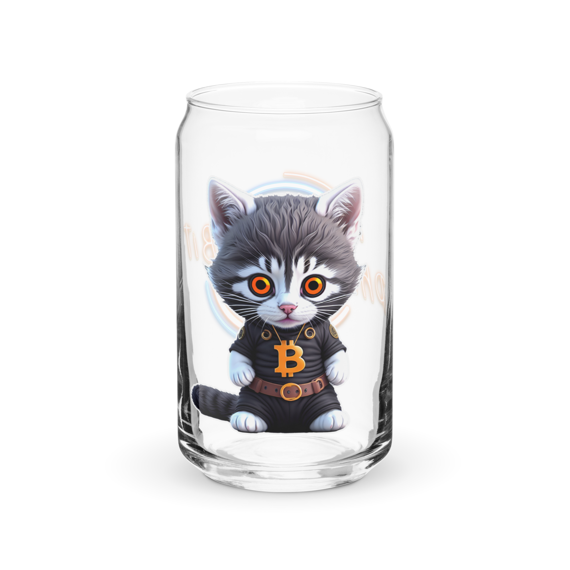 Unique Cool Bitcoin Cat 16oz can-shaped glass, by PhilanthroBit, printed on two sides. Whether you enjoy drinking refreshing sodas, iced coffees, cocktails, or even fancy mocktails, this glass is a perfect choice. With its trendy design and the timeless appeal of glassware, it will become a staple for your beverages or would make a wonderful gift idea.